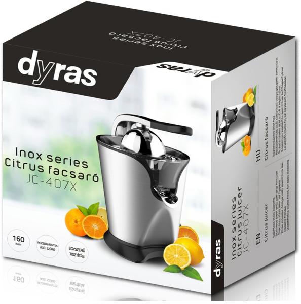 A Dyras JC-407X elektromos citrusfacsaró kiváló választás mindazoknak, akik friss, ízletes gyümölcslevekre vágynak reggelente vagy bármikor. A 160 watt teljesítmény biztosítja a hatékony facsarást, így gyorsan és könnyedén készíthetünk friss italokat otthonunk kényelméből. A rozsdamentes acél ház nemcsak elegáns megjelenést kölcsönöz a készüléknek, hanem hosszú távú tartósságot is garantál. Az egyszerű használatú dizájn lehetővé teszi, hogy akár kezdőként is könnyedén kezeljük a citrusfacsarót. Csak helyezzük a gyümölcsöt a készülékbe, és a mechanizmus gyorsan és hatékonyan kinyeri a levét. Az intuitív gombok és funkciók segítenek abban, hogy minden egyes facsarás élmény legyen, és élvezzük a friss, ízletes italok ízét és frissességét. A Dyras JC-407X elektromos citrusfacsaró nemcsak praktikus és hatékony, de stílusos kiegészítője is lehet konyhánknak. Kompakt mérete és elegáns megjelenése lehetővé teszi, hogy könnyedén tároljuk és használjuk akár a konyhapulton is, így mindig kéznél van, amikor friss gyümölcslevet szeretnénk készíteni. Legyen része az egészséges életmódnak és fedezze fel a Dyras JC-407X citrusfacsaró által nyújtott kényelmet és minőséget!